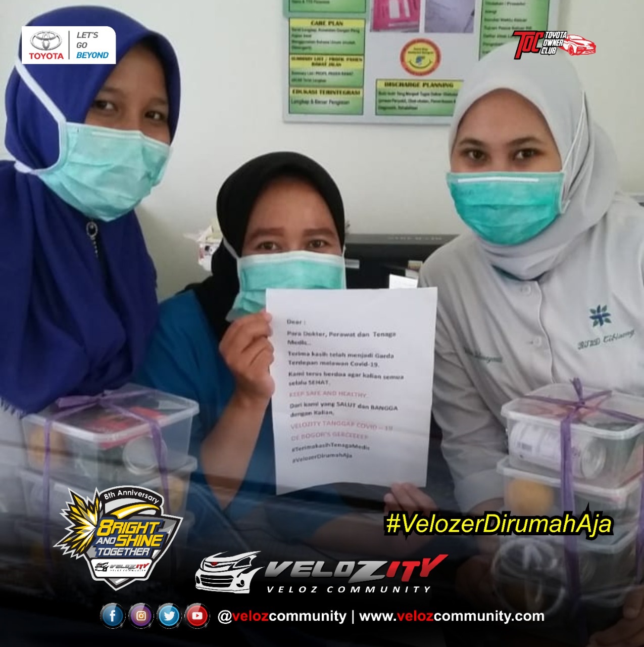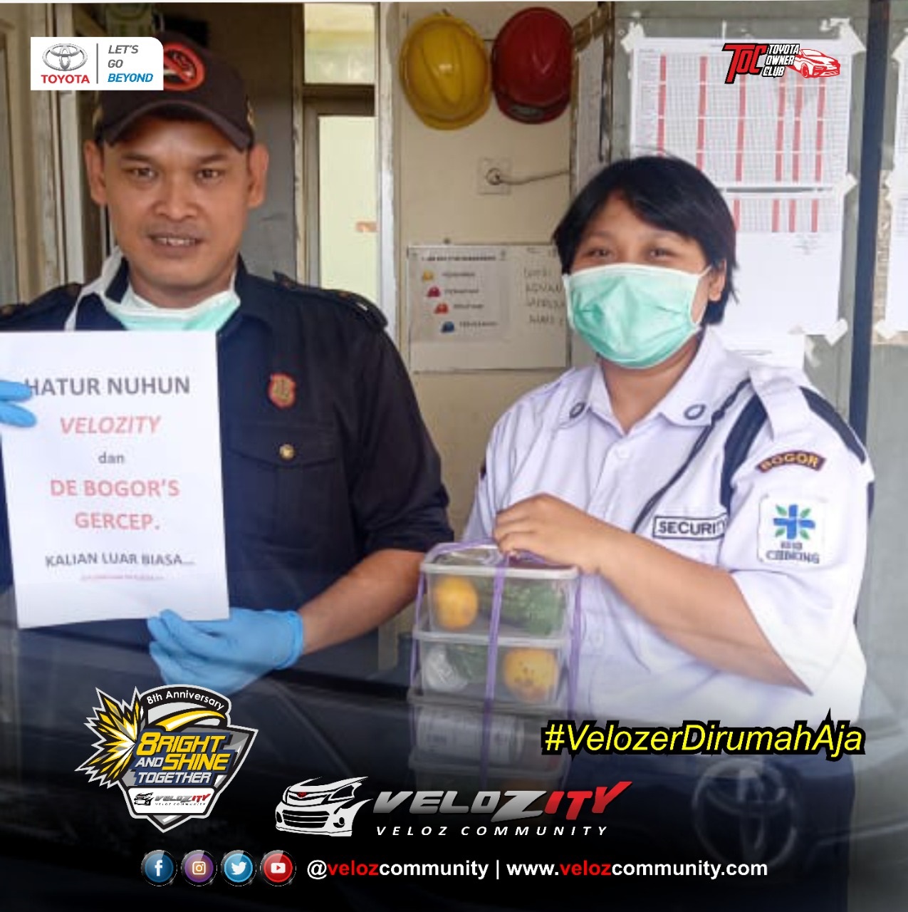Pencairan dana desa serta berbagai jenis bantuan sosial juga akan dipercepat dan dapat digunakan untuk penanganan corona. Disisi lain, serangan Virus Covid-19 yang makin masif menumbuhkan kembali semangat saling bantu diantara sesama manusia. Tak lepas dari pandangan kita bahwa Petugas Pelayan Kesehatan yang menjadi garda depan untuk penanggulangan wabah pandemic Virus Covid-19. Veloz Community (Velozity) ber-inisiatif membantu meringankan beban dengan Tebarkan Virus Berbagi Semangat Untuk Tenaga Pelayanan Kesahatan di Rumah sakit Umum Daerah (RSUD) Cibinong Bogor pada hari senin 23 maret 2020.