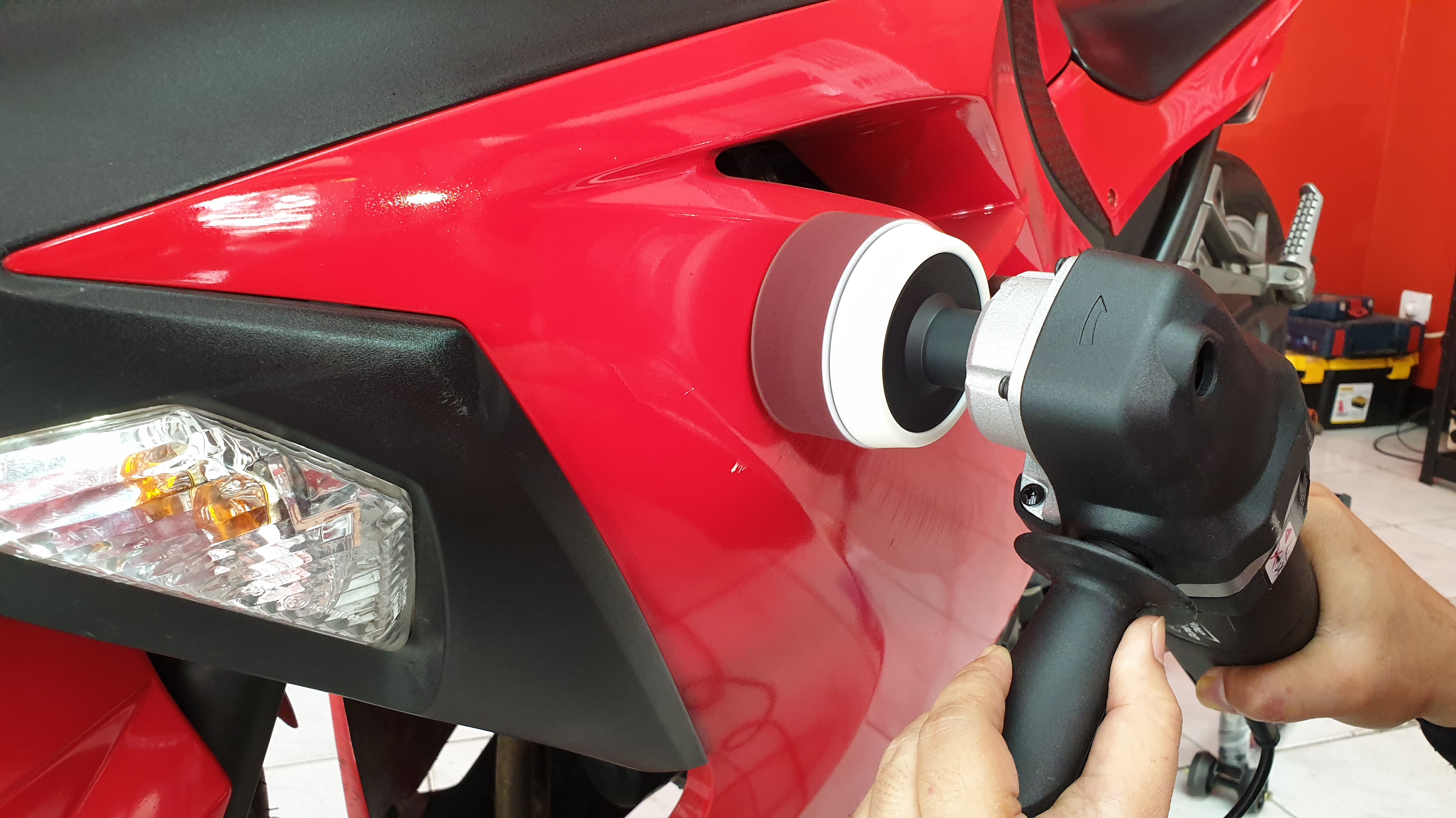 Setelah melapisi body sepeda motor dengan Liquid Wax secara merata, dapat melanjutkan dengan mengaplikasikan Vinyl Restorer.