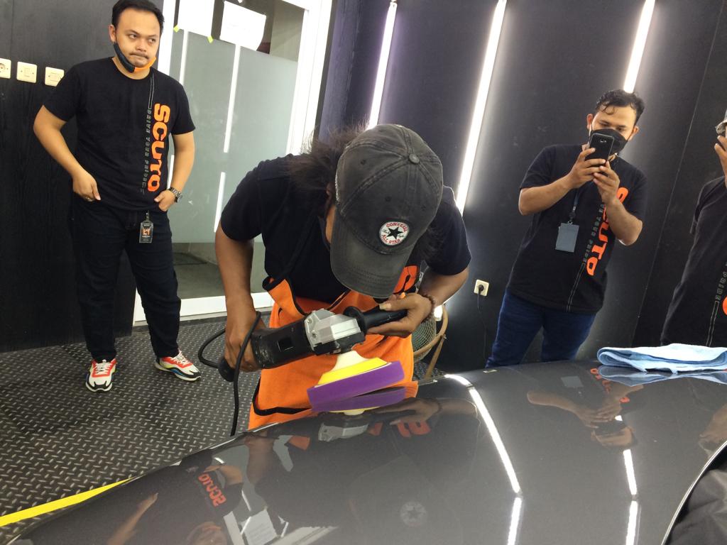 Acara yang berisi teori dan praktik ini selanjutnya dipaparkan oleh M HD Ichsan perwakilan dari Scuto Academy Division. Materi yang disampaikan begitu beragan mulai dari persiapan saat akan mengaplikasian Scuto Laminanting Nano Ceramic hingga bagaimana cara menjaga kendaraan agar senantiasa tampil prima dan lebih personal.