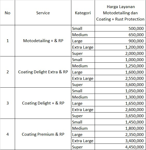 Bicara harganya, SCT Motodetailing menghadirkan layanan antikarat SCT Rust Protection yang sudah di-bundling dengan paket detailing atau coating. Berikut tabel harga paketnya.