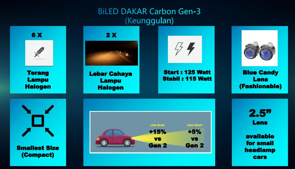 Keunggulan BiLED Dakar Carbon berdaya maksimal hingga 125Watt. Sementara stabilitas daya berada pada angka 115Watt. Untuk pencahayaan sinar jarak dekat bertambah 15% dan sinar jarak jauh bertambah 5% dari BiLED Dakar Carbon generasi ke-2.